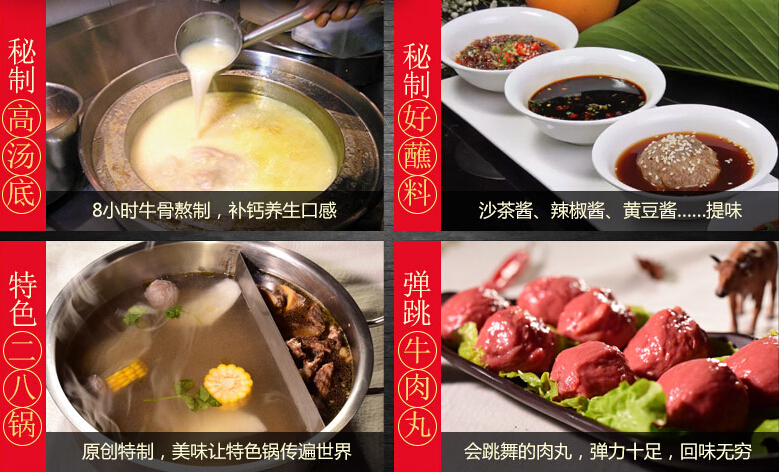 高兴壹锅集美味,养生,简约于一身,精选有机食材,当天宰杀牛肉, 剩余做成牛肉丸,绝不过夜,搭配传统自制养生酱料,推出纯正汕头牛肉火锅!